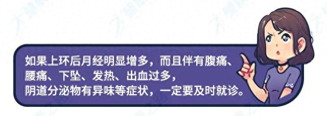 要注意,从上环后到下次月经来潮并干净前,不要过度劳累,避免过度食用辛辣、酒类等刺激性较强的食物,应避免性生活、盆浴、游泳等。注意上环后月经量有无改变。